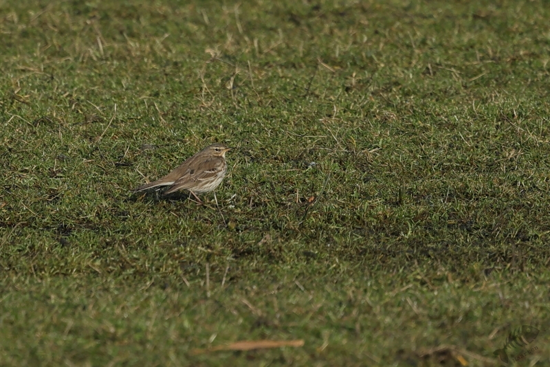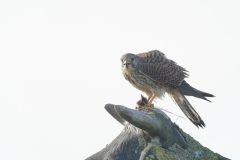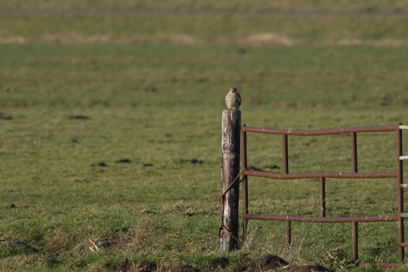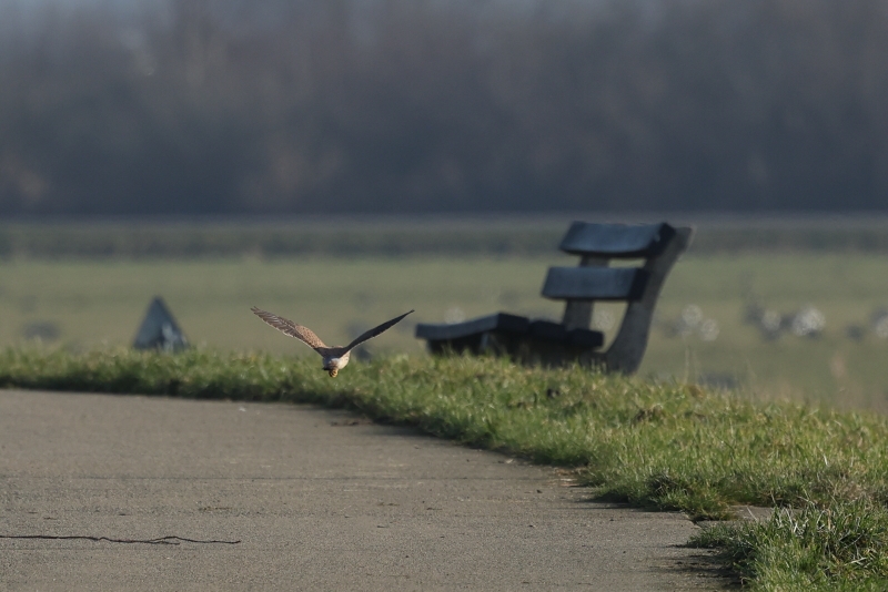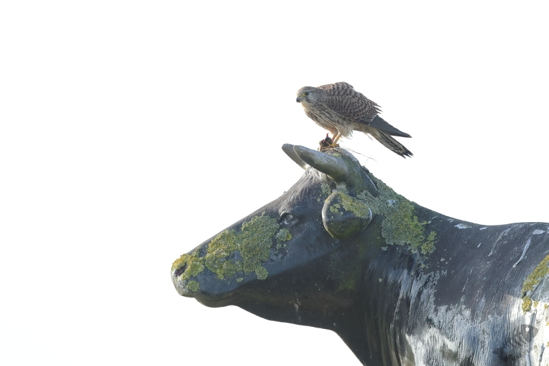 Het was fris, maar zonnig, wat de fietstocht wel heel lekker maakte. Ik had de indruk dat de vogels het eigenlijk maar niks vonden dat ik daar zo rondreed. Met regelmaat werd er opgevlogen en duurde het even voor ik mijn eerste foto’s hier kon maken. Ik vind het tegenwoordig eigenlijk leuker de vogels in hun omgeving te laten zien en hoef ze dus niet vlak voor de camera te krijgen. De Grote Zilverreiger kwam wat mij betreft zo heel mooi in beeld. Gelukkig zat de Waterpieper, gezien zijn grootte, iets dichterbij en kwam ook hij mooi in beeld. Zo reed ik steeds verder naar het westen en kwam uit bij de laatste boerderij, waar je rechtsaf kunt slaan om via het fietspad weer naar het oosten, richting het Gemaal te rijden. Er staat een grote kunst-koe bij die boerderij en een Torenvalk, die ik al verschillende keren had zien vliegen, zat bovenop de kop van de koe haar vers gepakte prooi op te smullen. Ik heb haar rustig laten eten en ben het fietspad opgereden richting het Gemaal. Er zat voldoende op het water, maar alles best ver weg, behalve een vrouwtje van het Nonnetje. Een paar Dodaarsjes speelden verstoppertje en zij wonnen: elke keer als ik maar dacht een foto te kunnen maken, doken ze onder of verdwenen in de begroeiing. Daarom ben ik maar doorgereden waar ik ter hoogte van het Gemaal weer een Torenvalk trof. Ze vloog net van me weg vlak boven het fietspad en ik kon nog net een foto van achteren maken.
